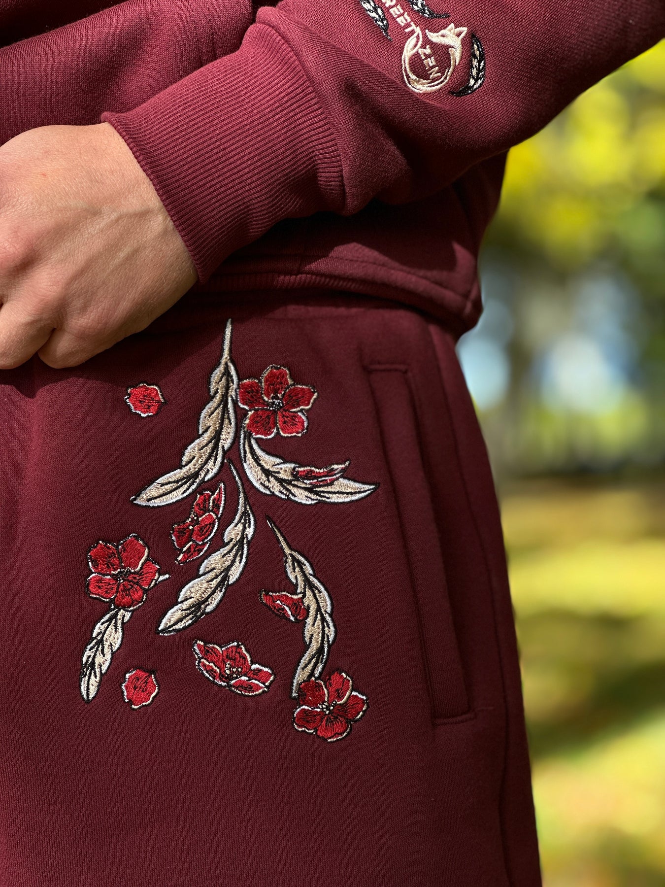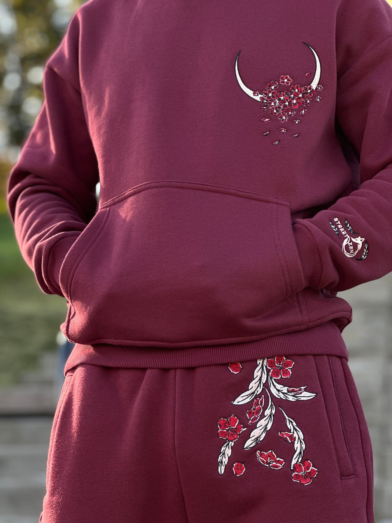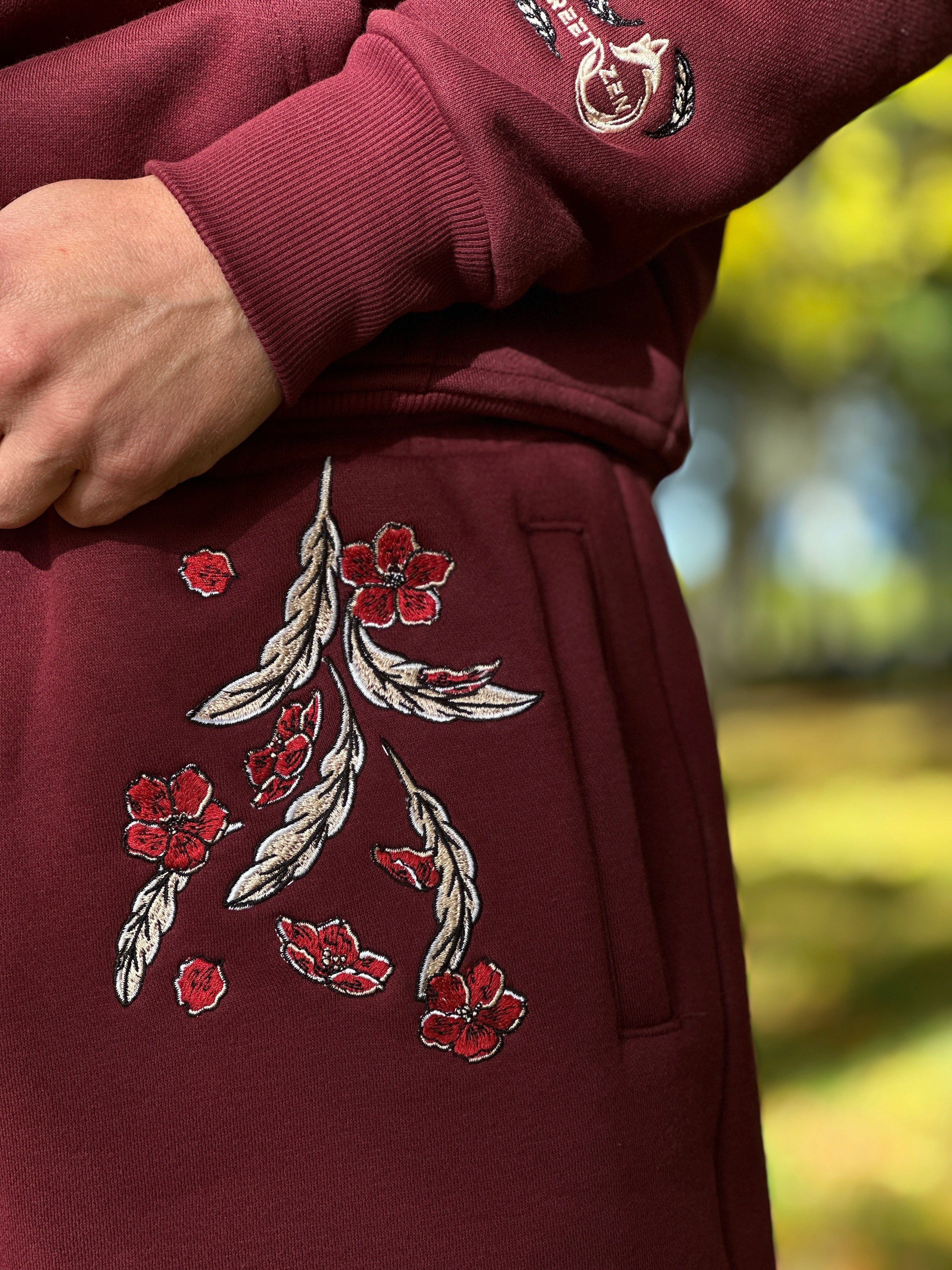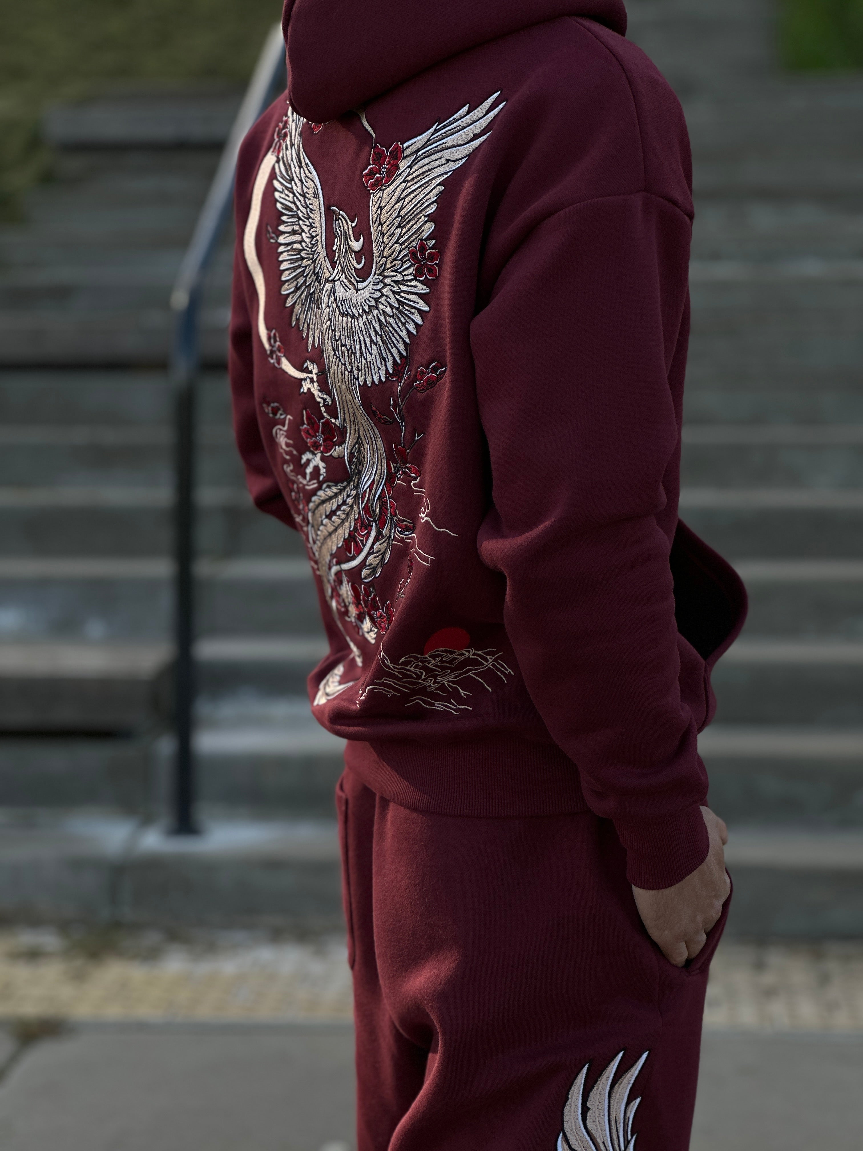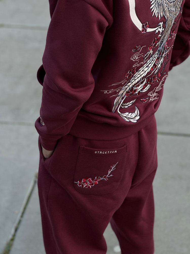 - The design features a White Gold Phoenix Embroidery with Maroon shade Sakura Blossoms