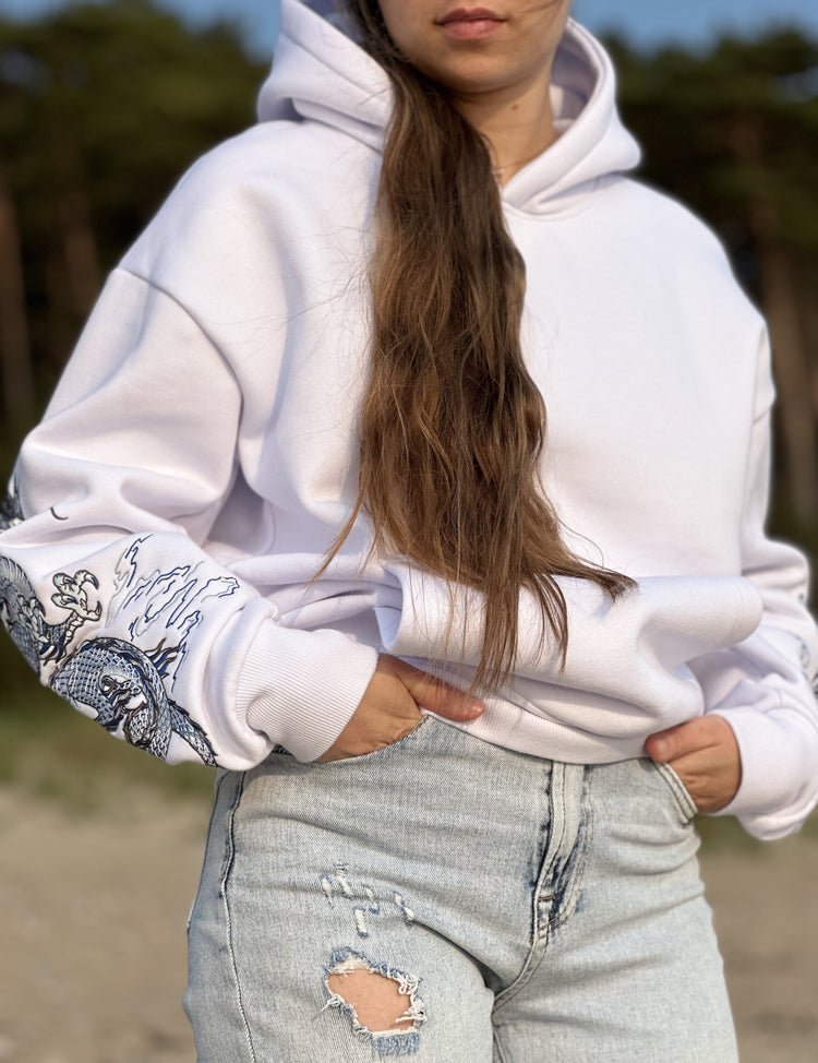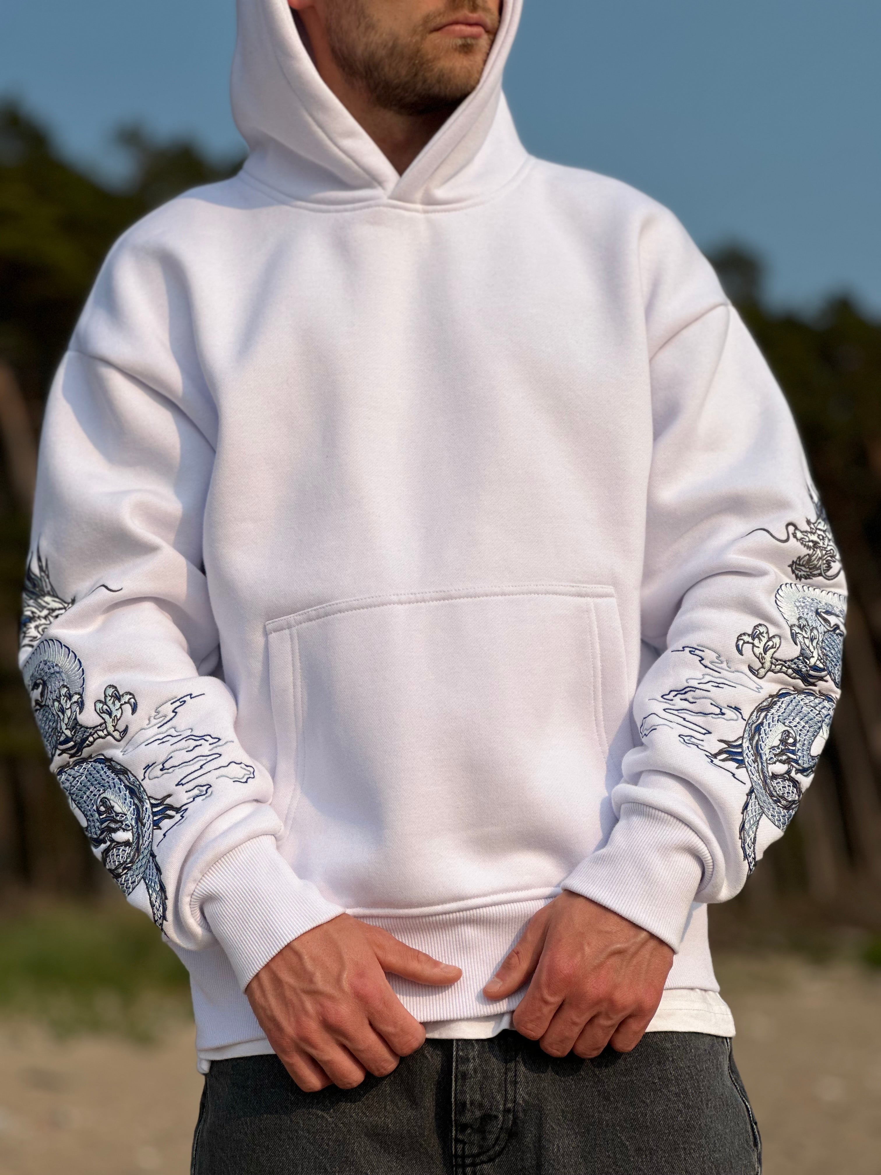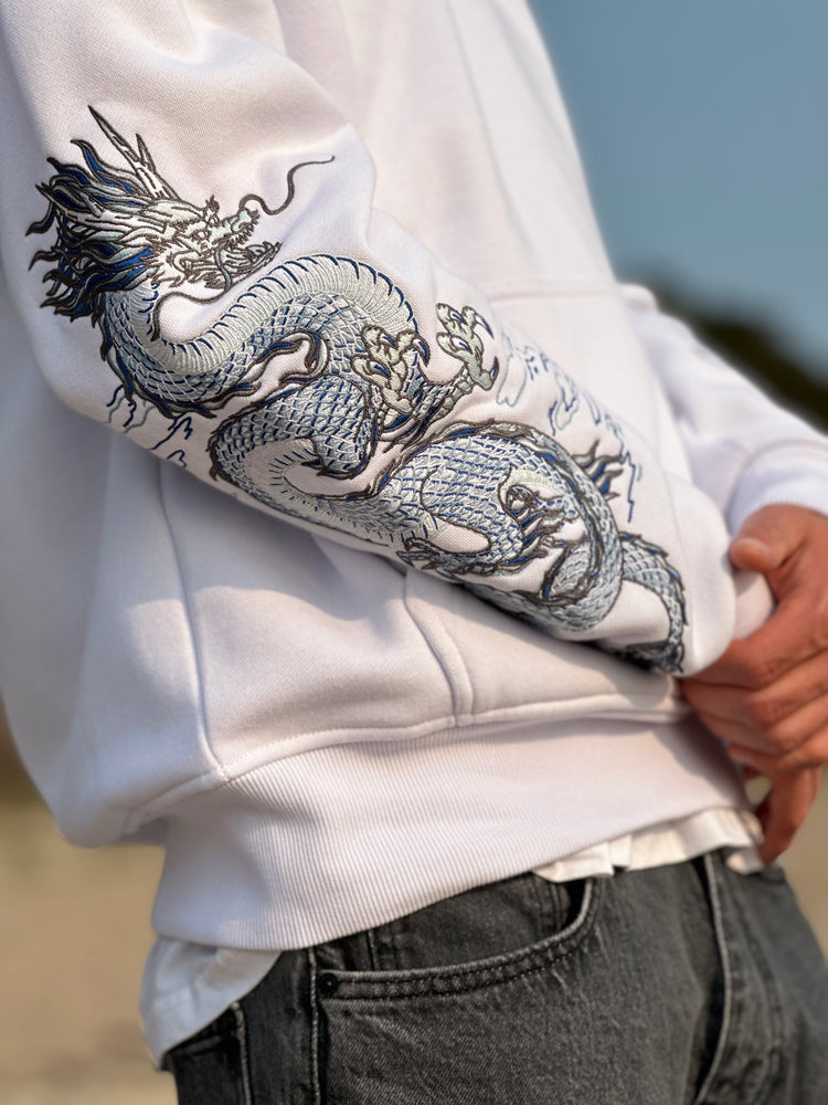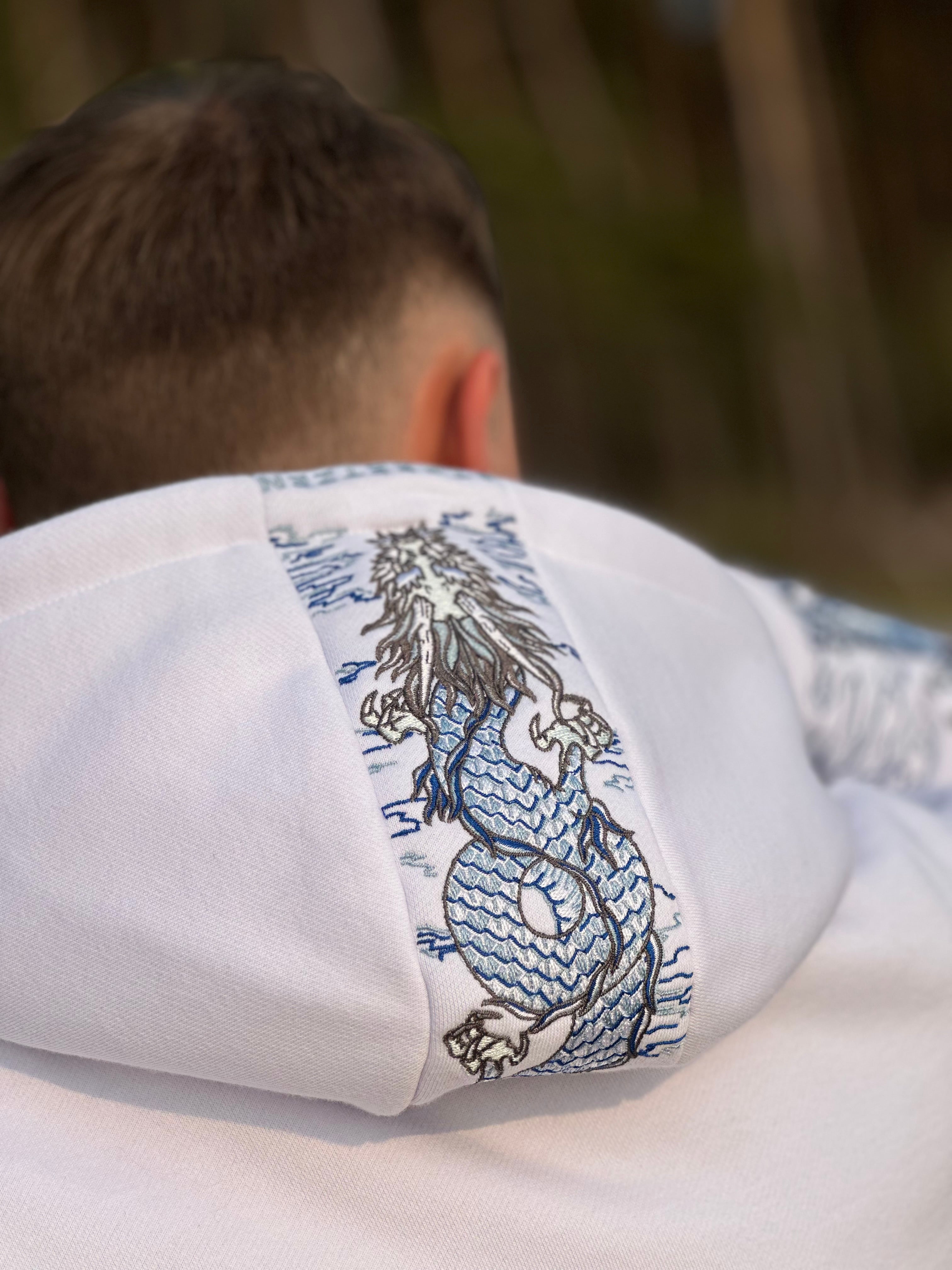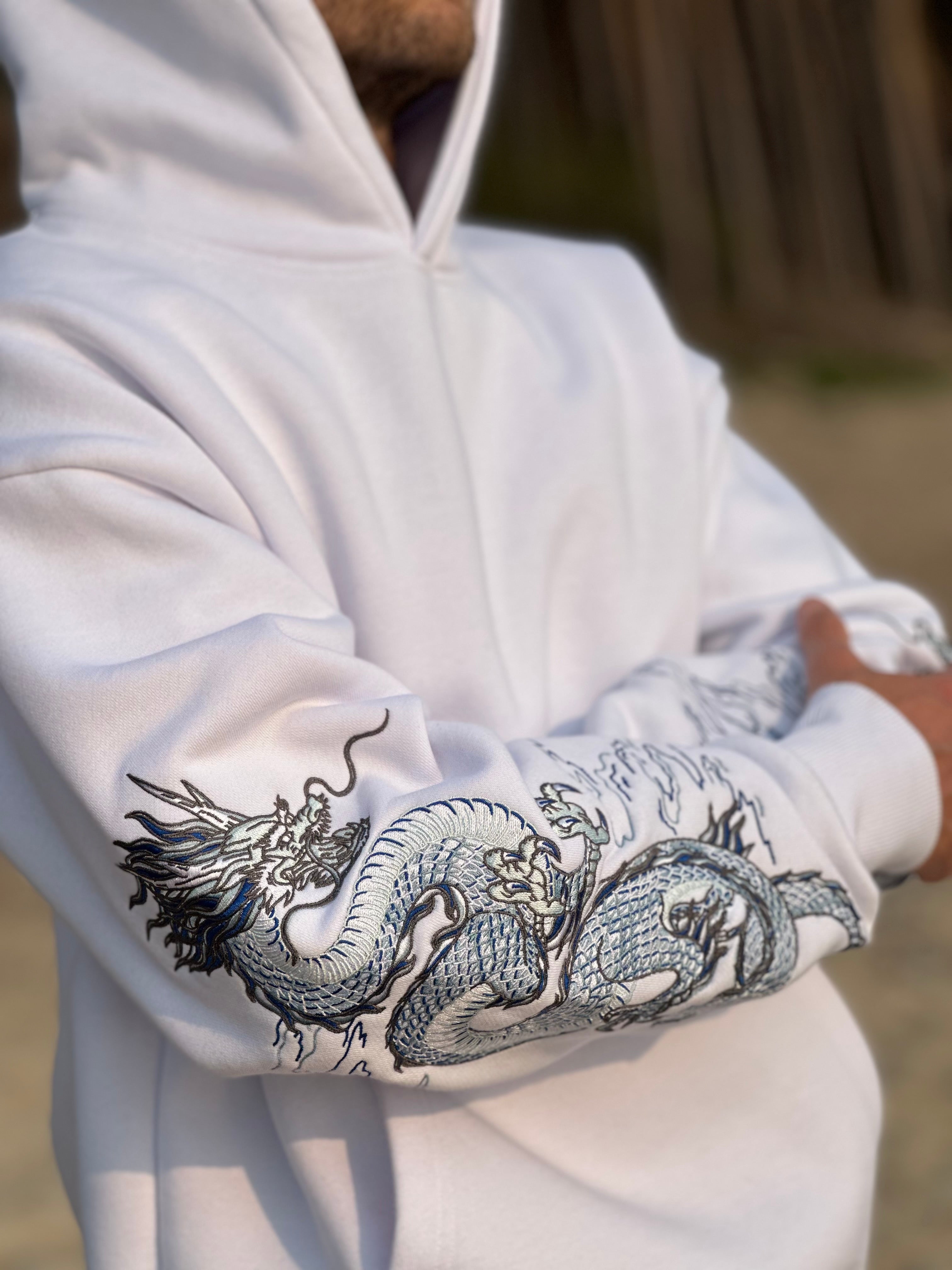 Sea Dragon Heavy Embroidery Hoodie 400GSM - Pearl White