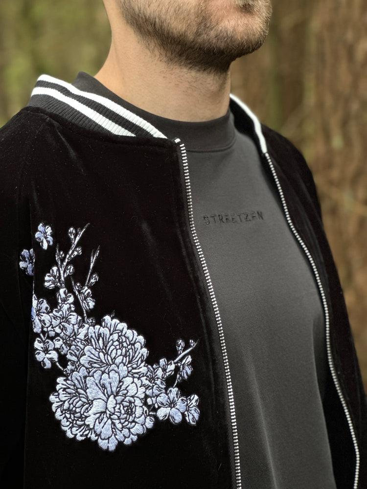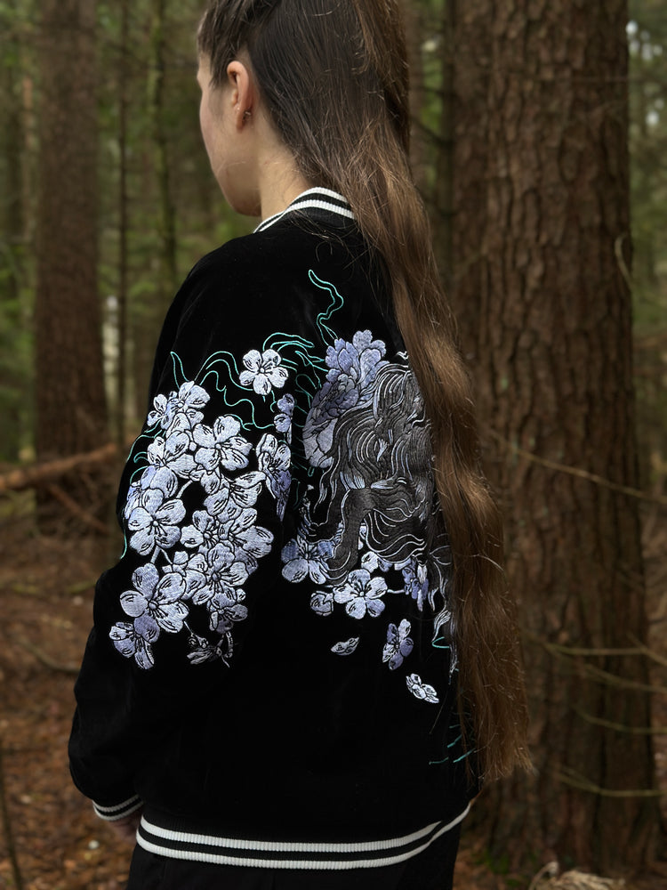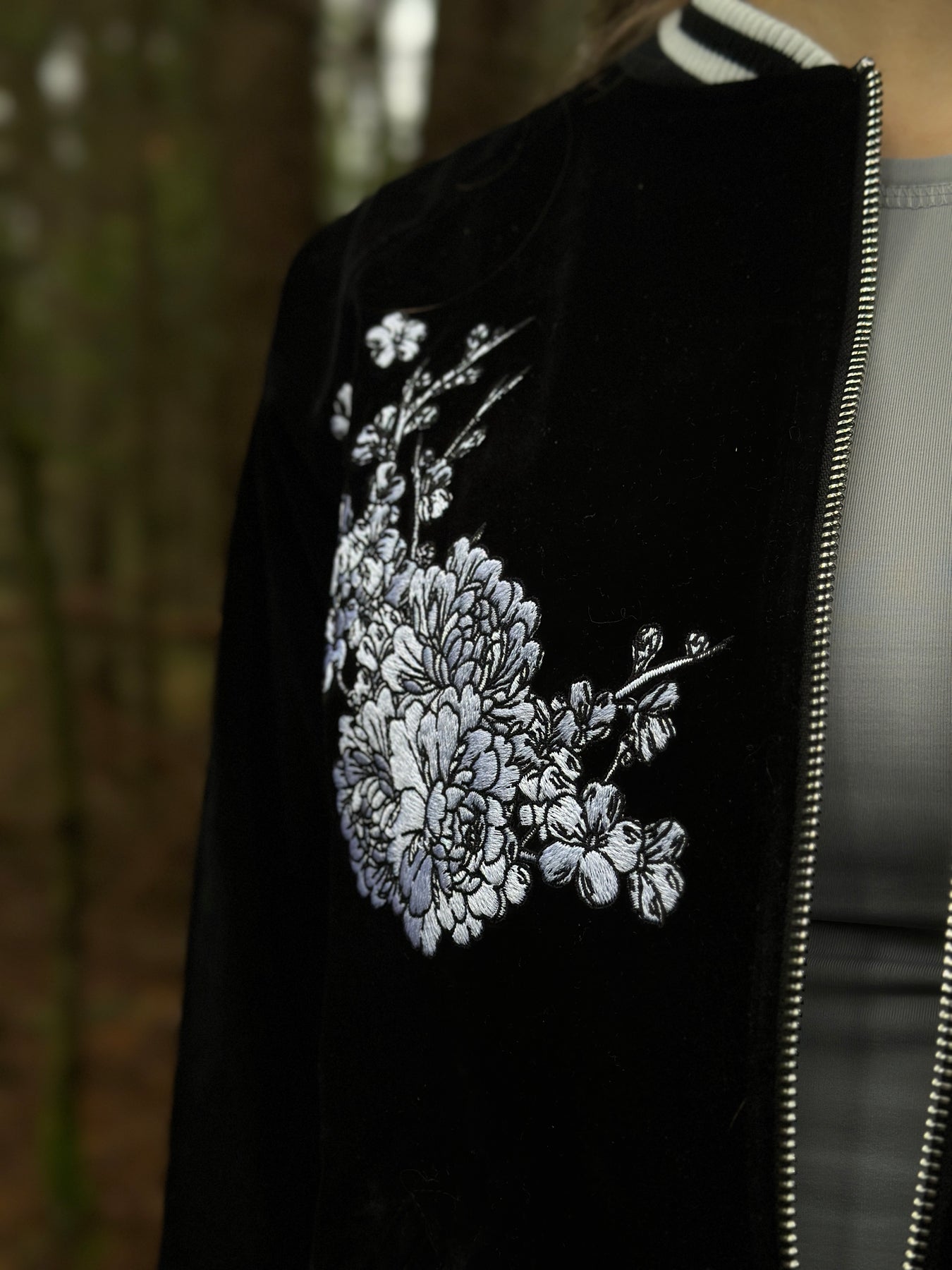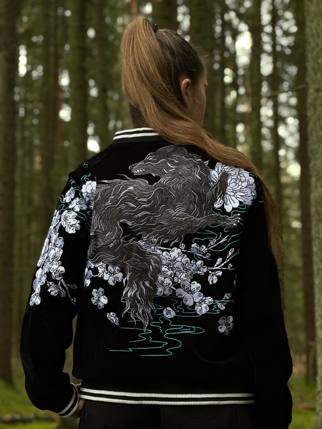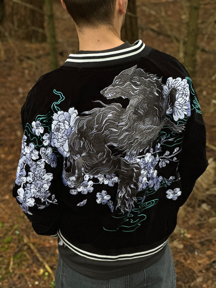 (PRE-ORDER) Midnight Wolf Embroidery Velvet Jacket - Unisex - Obsidian Black